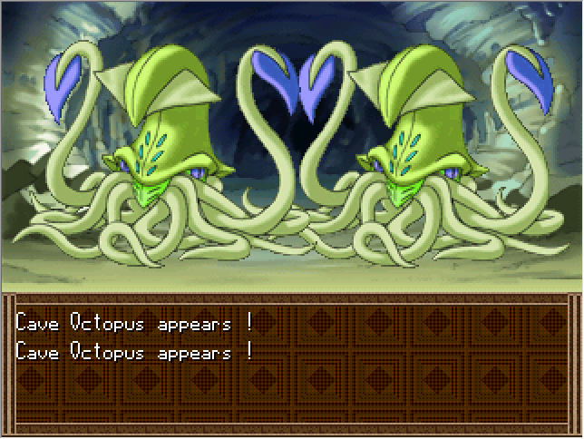 Cave Octopus are tanky but spectacularly weak. 46XP. You also sometimes encounter Octohuge in here. The pink ones we saw at the FISH BATTLE area.