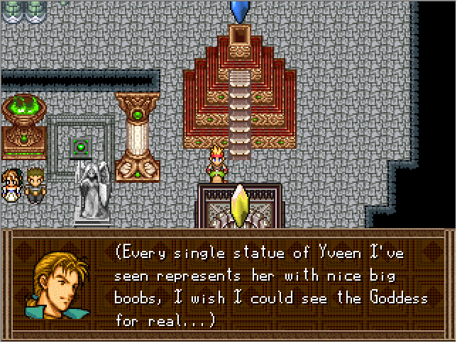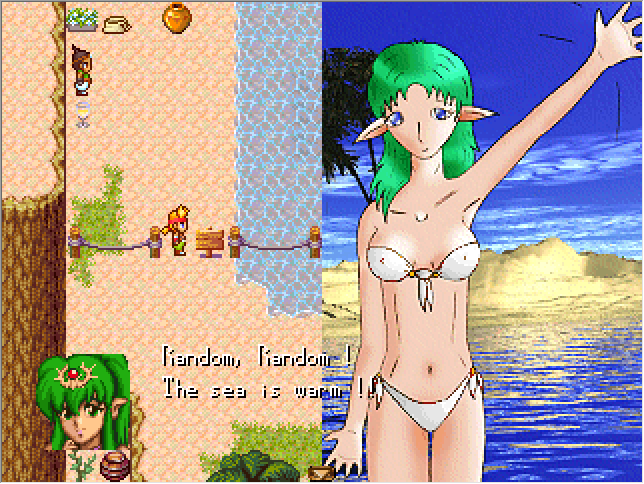 There's been a running joke that Sarah complains how cold she is after we get loot in this dungeon, and at this point Random just laughs at her and tells her it's cos she's nearly completely nude in her outfit. Sarah only seems to realise this when Random points it out.