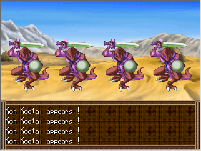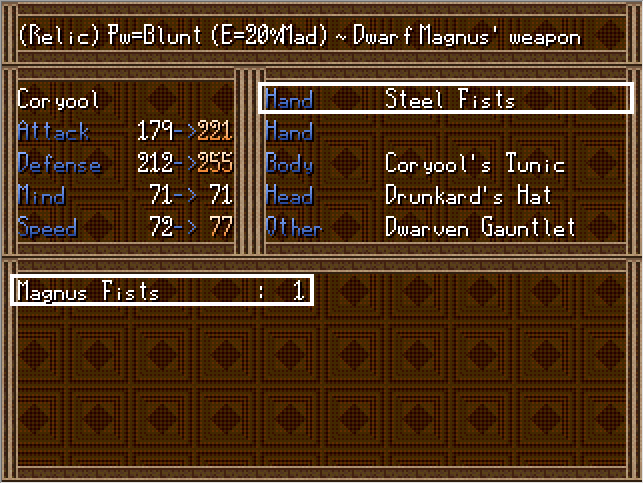 This fight isn't as challenging as Torahl. He does KO Random at one point but after that he's no problem. He just has some strong magical spells is all. Defense Up takes care of that. He's actually one of the only enemies thus far capable of doing high damage to Coryool, as well. 130XP.